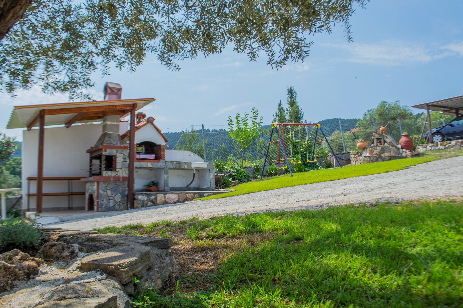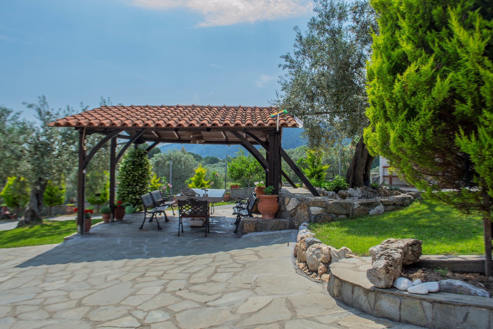 -BBQ πλήρως εξοπλισμένο, με χώρους χαλάρωσης μέσα στον μαγευτικό κήπο.